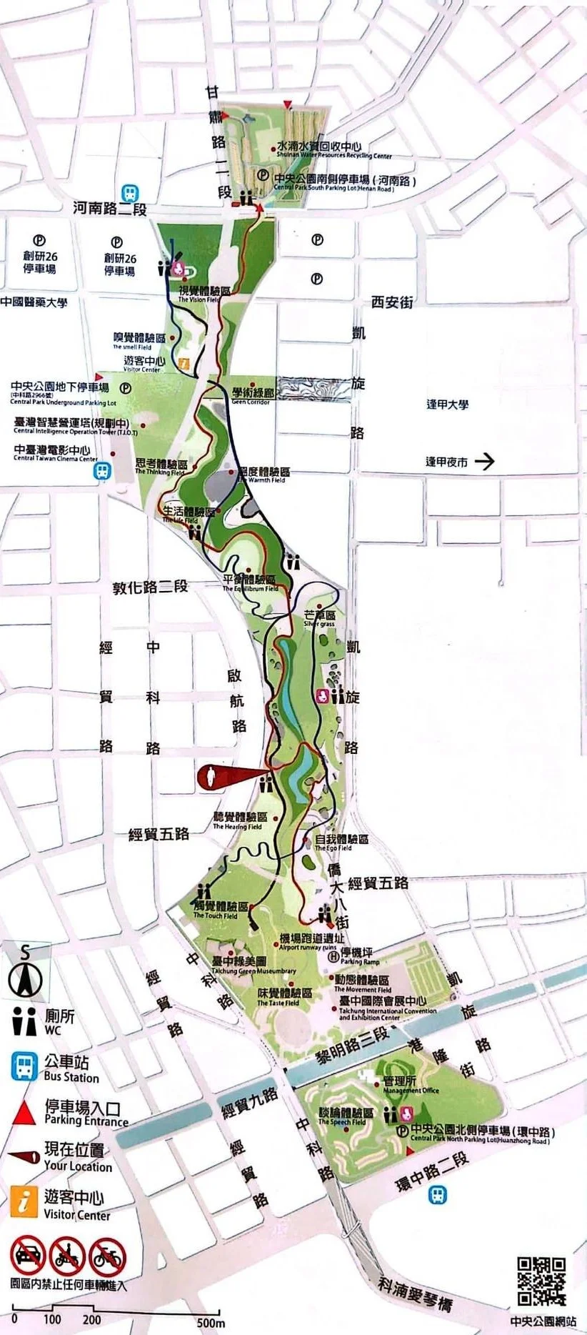 台中中央公園導覽圖,圖上標示了遊客中心、公共廁所、停車場與12感官體驗區等位置。